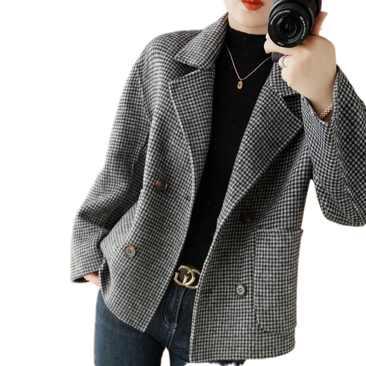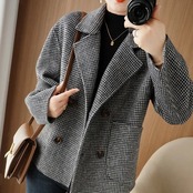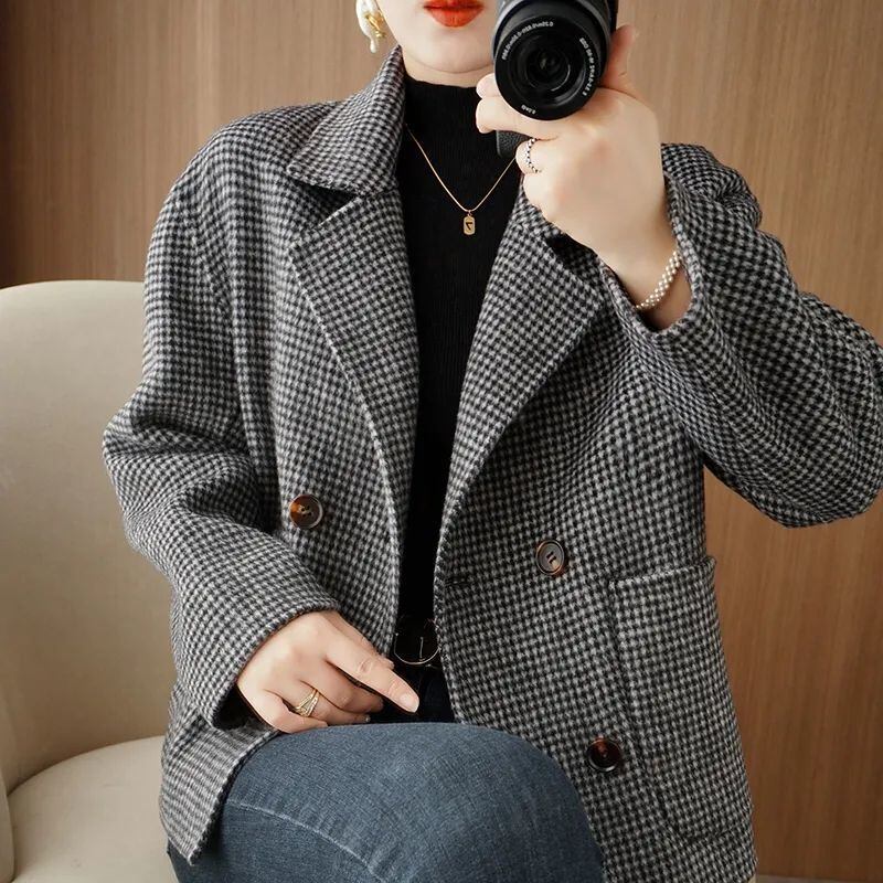 大人気の【大人気】千鳥格子柄ウールコートレディースショートスタイルプチ 秋冬新作ハイエンドファッションチェック柄ウールコートは、スタイリッシュな女性にぴったりの注目アイテムです。このコートは、特におしゃれを楽しむ方へ向けてデザインされており、カジュアルなデイリールックから特別なシーンまで幅広く活躍します!