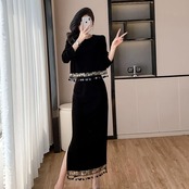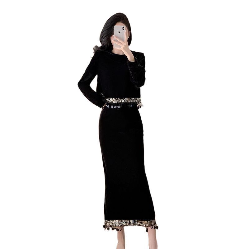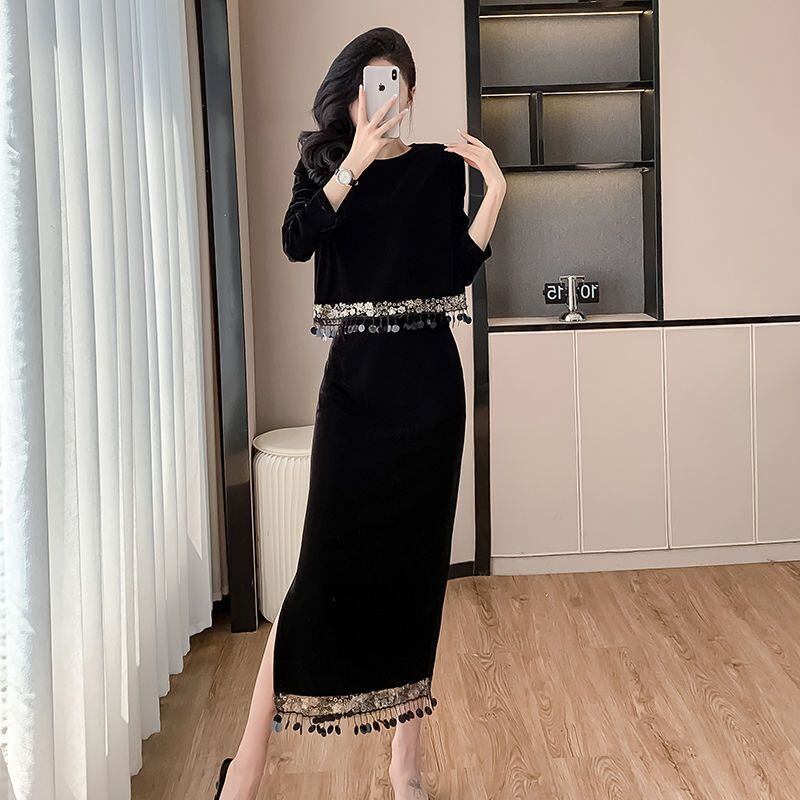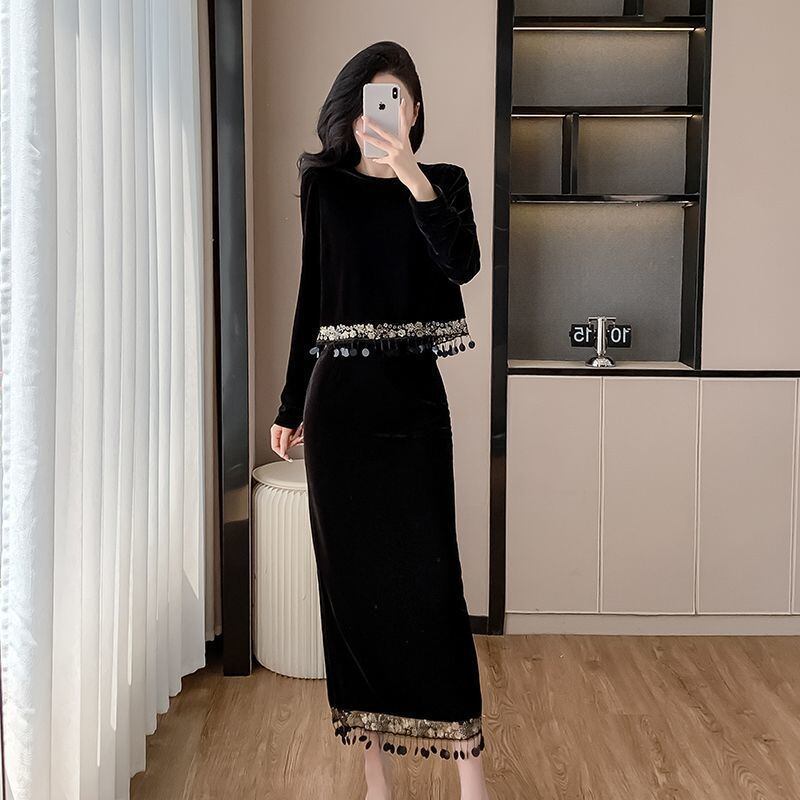 高品質なベルベット素材を使用し、滑らかで気品ある着心地が特徴です。スパンコールスプライシングが施されたタッセルトップスは、華やかさをプラスし、視線を集めるスタイルを実現します。スカートは流れるようなシルエットを持ち、エレガントでありながらも動きやすさを兼ね備えています。どんな体型にもフィットし、あらゆるコーディネートと相性抜群です。秋冬の特別なシーンでも自信を持っておしゃれを楽しむことができます。
