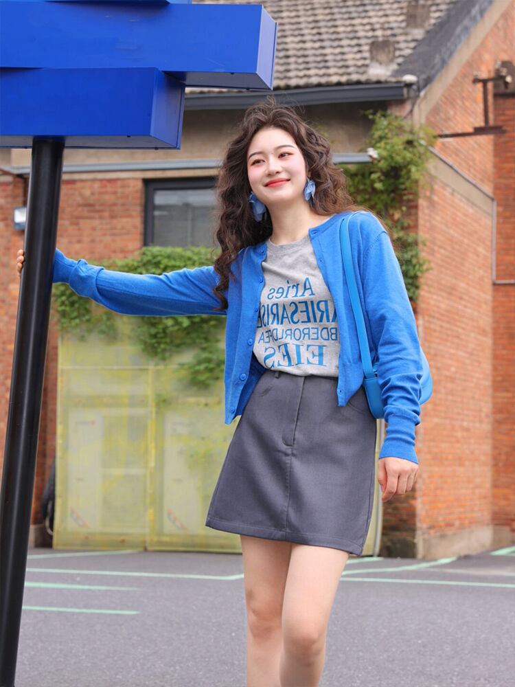 高品質なニット素材を使用しており、軽やかで心地良い着心地を実現しています。独特なクラインブルーの色合いは、明るく洗練された印象を与え、さまざまなスタイルに合わせやすいのが魅力です。また、ショート丈のデザインは、レイヤードスタイルにも最適で、身体のラインを美しく引き立てます。この素敵なカーディガンは、春のファッションに明るさとスタイリッシュさをプラスしてくれること間違いなしです。