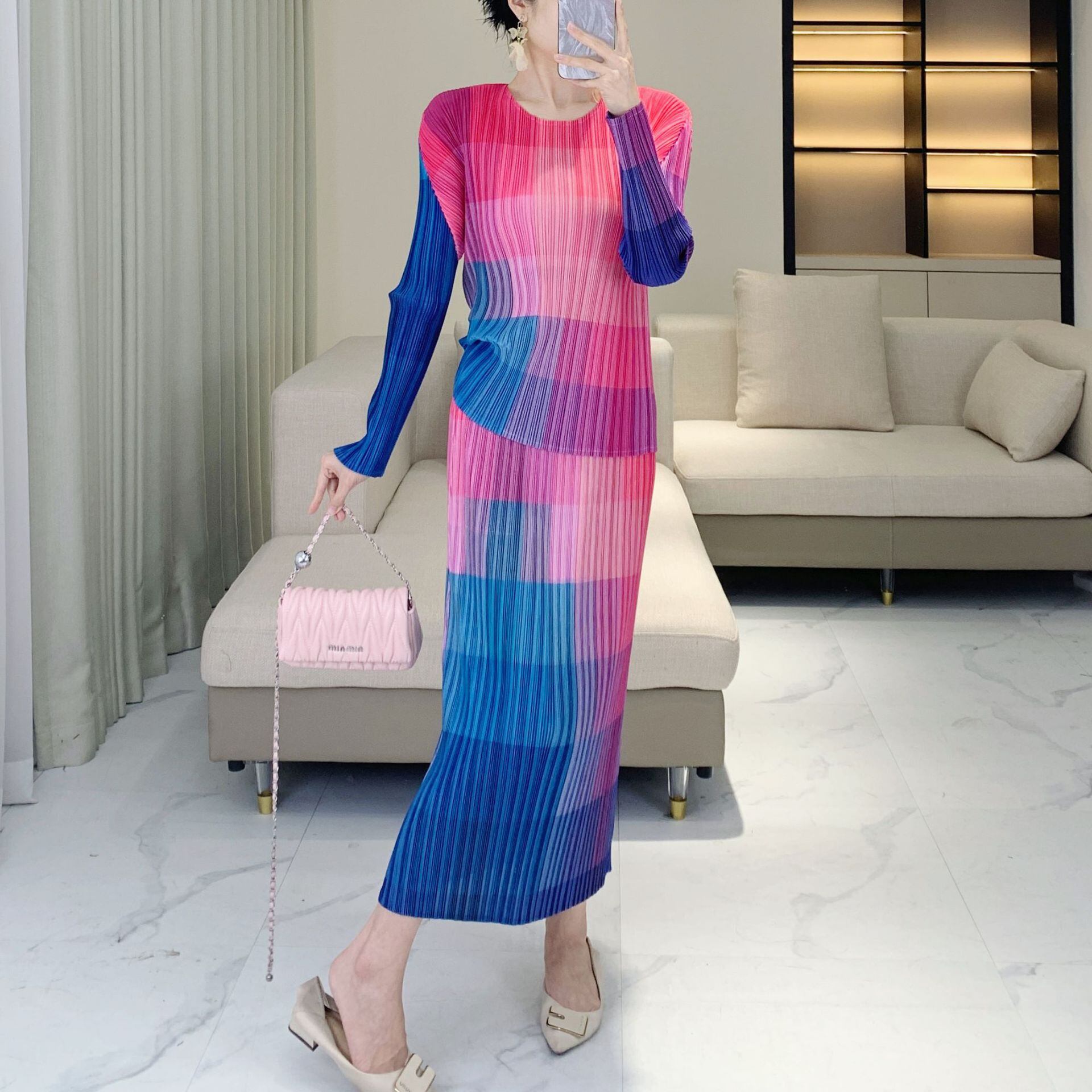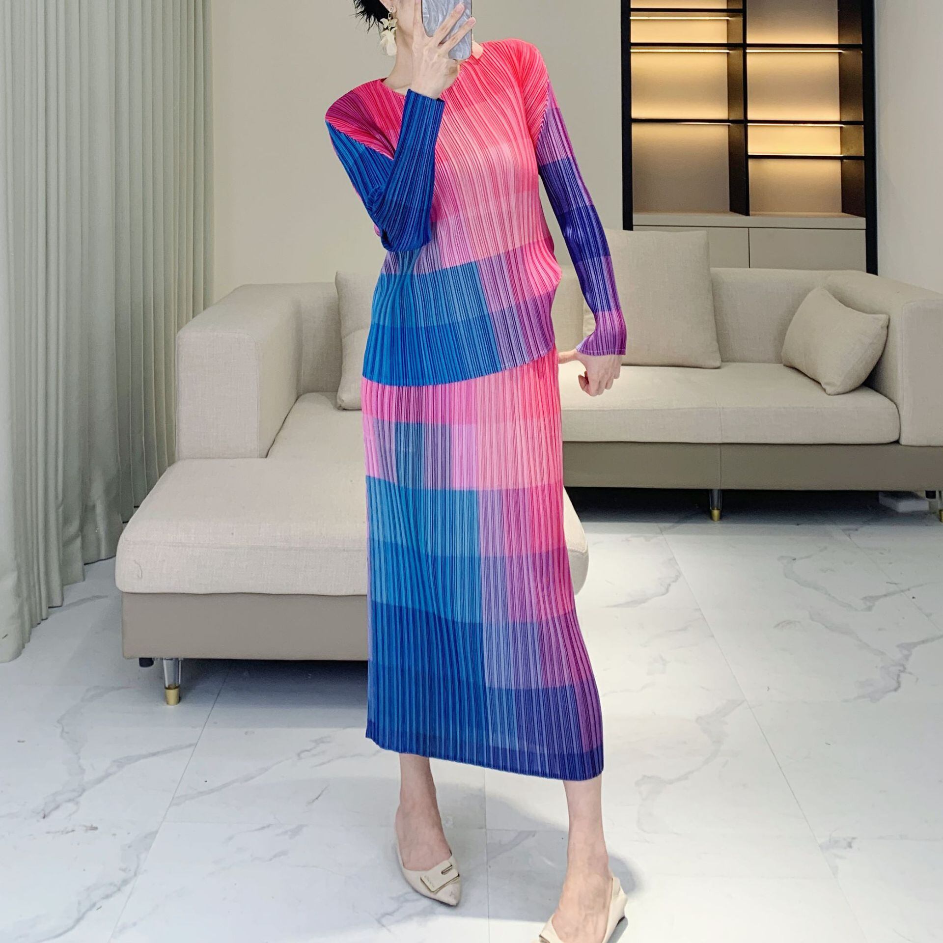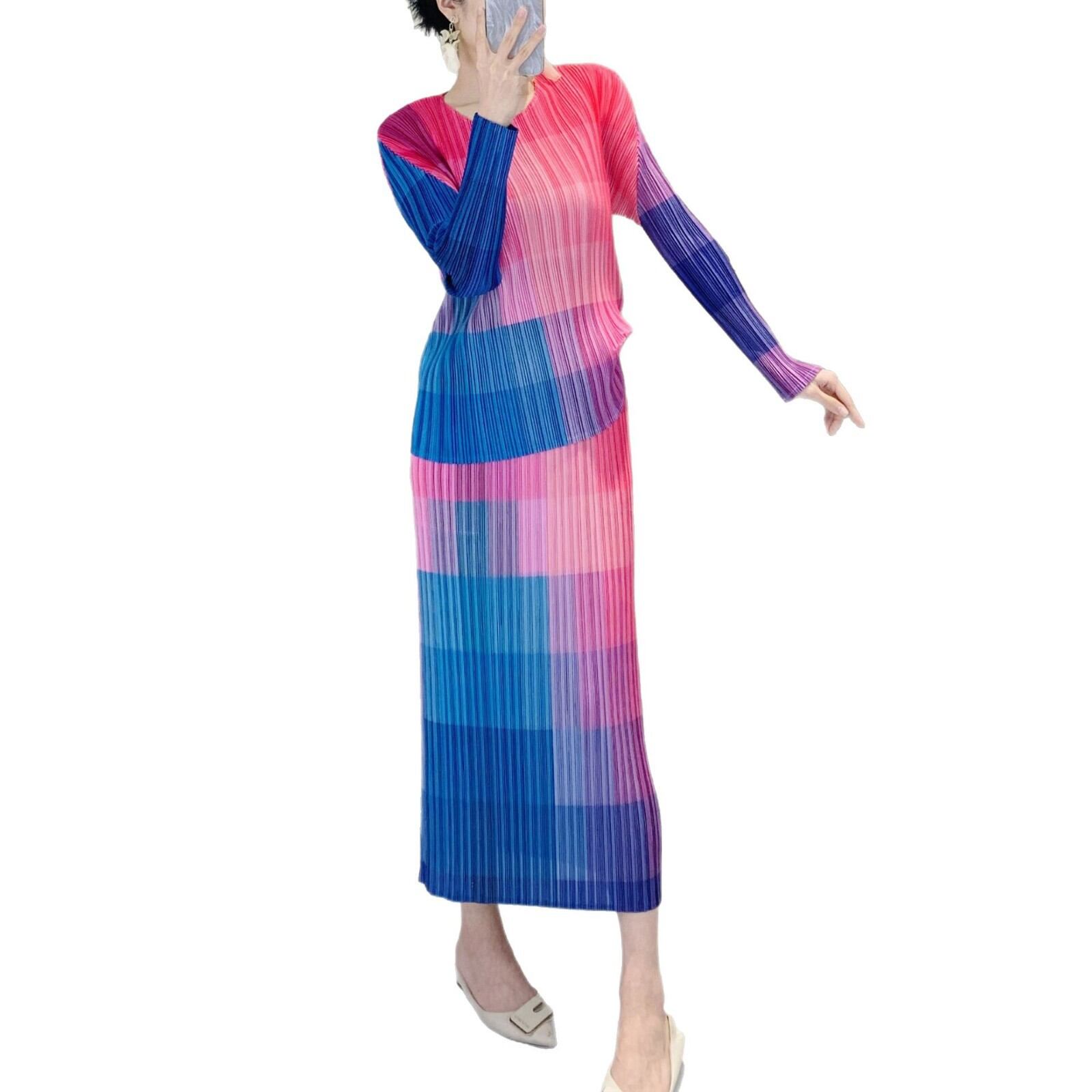 デザイン/春夏プリーツトップスとグラデーションチェック柄スカートのツーピーススーツ