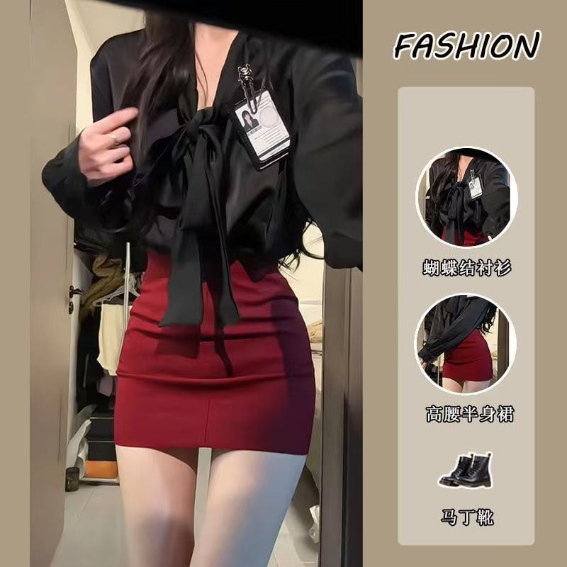 大人気の【大人気】純粋な欲望のホットガールスタイルのツーピーススーツ高級ブラックシャツトップ女性春ファッションスリミングとスリミングヒップスカートは、これからの季節にぴったりのトレンドアイテムです。このスーツは、洗練されたブラックシャツと、スリミングなヒップスカートの絶妙な組み合わせが特徴で、どんなシーンでもあなたを引き立てます!