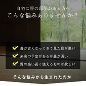 い草生地の両面に撥水加工を施した(ただし、お湯・お茶・コーヒーなど40℃以上の水分ははじきません)上敷です。上敷きを敷くだけで畳のお部屋をリフレッシュ出来ます。日焼けしてしまった畳のリフレッシュに、新品の畳を汚さないためのカバーにご使用下さい。一般的なイ草上敷はご使用の前に乾拭きが必要ですが、本商品は生地に泥染めをした上から撥水のコーティングをしているため、乾拭きの必要がありません。届いた商品を広げて頂いてそのままご使用頂けます。生地の表裏両面に撥水加工を施していますので、シミ・汚れの付着防止効果があります。、両面使用可能で経済的なリバーシブルです。長さ115〜120cmの国産(九州産)い草を使用しています。そのうち約88cmを使用しています。ヘリ際はある程度白みを帯びます。(日焼けではありません、い草の根元と先端部分の色です。)い草は長いものほど高級になります。い草は先端部分が赤茶色く、根元が白く真中が青(緑)色です。真中の良質な青の部分を多く使用するほど、丈夫で綺麗な仕上がりとなります。またイ草は使用するうちに日焼けをしますが、真中の青の部分を多く使用したものほど、全体が綺麗にムラなく日焼けし、味が出ます。国産(九州産)のい草を使用しています。国産い草は一本一本が太く、表皮が厚く繊維がキメ細かいので弾力性があり、耐久性に優れています。い草には空気の清浄化作用、湿度の調節作用があり、汚れにくいといった特徴があります。い草に青森ヒバ加工を施しています。(抗菌、防臭効果)表裏の両面が使えて経済的です。