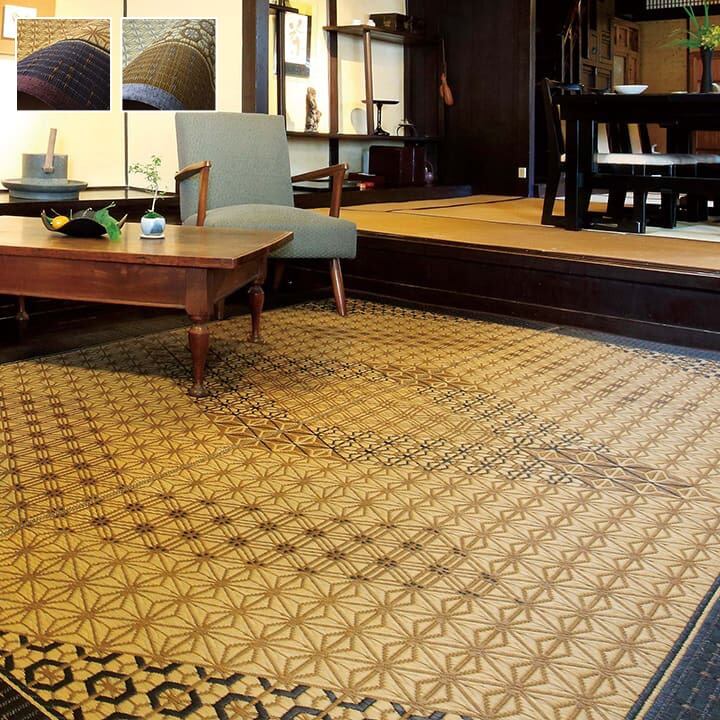 伝統工芸である組子のデザインをい草で表現したラグです。い草には空気の自然浄化作用、湿度の調節作用などがあります。ホットカーペットカバーとしても使用できます。い草に青森ヒバ加工を施しています。(抗菌、防臭効果)裏面には滑りにくい加工をした不織布を使用しているため、フローリングにも最適です。