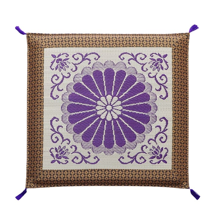お盆の準備や、新しくご仏壇をご購入された方にお勧めの御前座布団です。側地は袋織りという技法で仕上げました。折れ曲がりが複雑なので長いイ草を使用しないと切れてしまいます。縦糸が密なので、しっかりとして破れにくいのが特徴です。国産(九州産)のい草を使用しています。一本一本が太く、表皮が厚く繊維がキメ細かいので弾力性があり、耐久性に優れています。い草には空気の自然浄化作用、湿度の調節作用などがあります。また汚れにくく、使用するうちに黄金色に変化し味が出ます。い草にヒバエッセンス加工を施しています(抗菌防臭効果)。中材にはポリエステルわたを凝縮して仕上げた、固わたを40mm使用しています。程良い弾力性があり、ヘタリにくいのが特徴です。