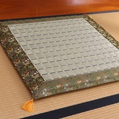 お盆の準備や、新しくご仏壇をご購入された方にお勧めの御前座布団です。側地は掛川織りという技法で仕上げました。掛川織りは九州地方の伝統的な織り方です。大きな目と小さな目に交互に織込んだ美しく洗練されたモダンなデザインが人気です。また厳選された良質の太く長いイ草を高密度に織込んでいますので丈夫で耐久性があり、しかも素足に心地よいクッション性とボリューム感があります。い草には空気の自然浄化作用、湿度の調節作用などがあります。また汚れにくく、使用するうちに黄金色に変化し味が出ます。い草にヒバエッセンス加工を施しています(抗菌防臭効果)。中材にはポリエステルわたを凝縮して仕上げた、固わたを40mm使用しています。程良い弾力性があり、ヘタリにくいのが特徴です。