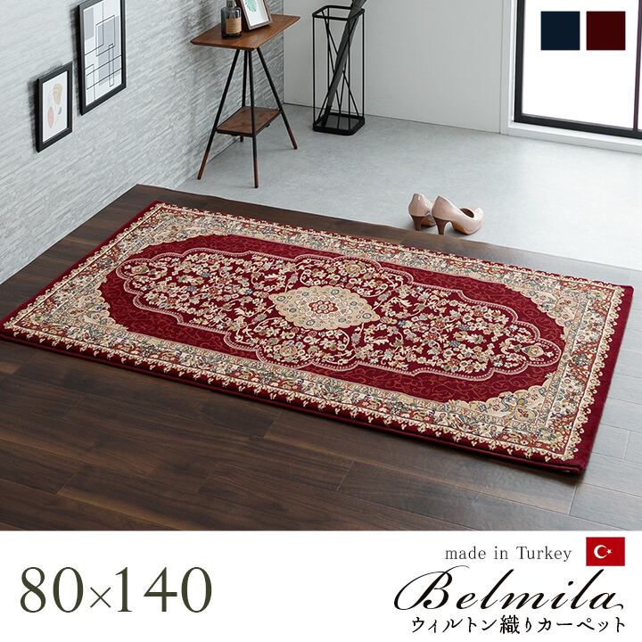トルコ製の最高級ウィルトン織りカーペットです。ウィルトン織りは、非常に耐久性の高いカーペットです。家の中でも靴を履いて生活するヨーロッパで、土足で扱うことを前提として作られておりますので、長時間踏みつけてもヘタリにくく、弾力性もあり長くご使用頂けます。また、高密度にパイルを織り上げることで、耐久性プラス繊細な柄を表現できるのも特徴です。本商品の『繊維の密度を表すノット数』は75万ノットの最高級クラスです。ぎっしりとパイルが詰まっていますので弾力性に富み踏み心地もしっかりとしています。また、パイル数を多くすることにより、より繊細でより色鮮やかなメダリオン柄を表現しました。プリントものには出せない高級感・重厚感のある繊細な柄をお楽しみ下さい。本商品のパイル部分にはポリプロピレン素材を使用しております。ポリプロピレンはヘタリにくく、耐久性に優れ、繊維の中でも軽い素材です。また、汚れが付着しにくく、遊び毛や毛玉が非常に出にくいという特徴もあります。本商品にはヒートセット加工を施しております。ヒートセット加工をすることで、柔らかく、なめらかなタッチ感に仕上げました。ホットカーペットカバーや床暖房にも対応しております。安心して年間お使い頂けるカーペットです。※玄関などでご使用の際は、市販のスベリ止めシートなどの併用をおすすめします。