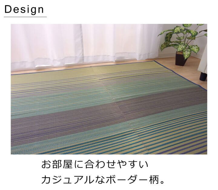 お部屋に敷きやすいカジュアルない草ラグです。裏面には滑りにくい加工をした不織布を使用しているため、フローリングにも最適です。い草には空気の自然浄化作用、湿度の調節作用などがあります。い草に青森ヒバ加工を施しています。(抗菌、防臭効果)