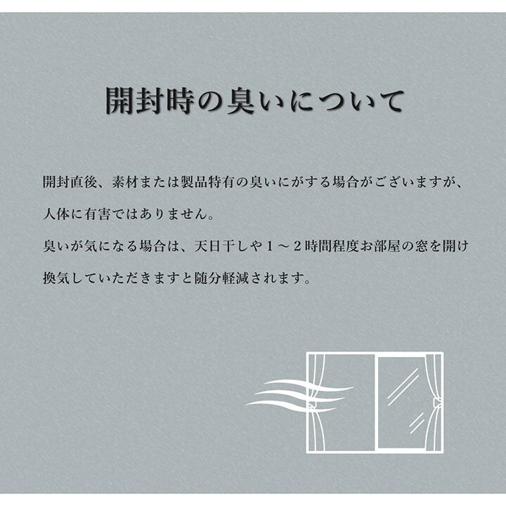 素材または製品特有の臭いにより、ご使用当初はにおいがする場合がございますが、人体に有害ではありません。天日干しや一日に1〜2時間程度お部屋の窓を開けて換気していただきますと1〜2週間で随分軽減されます。