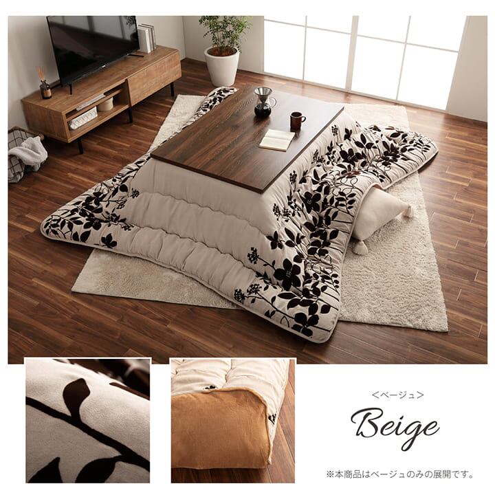 シンプルなリーフ柄をあしらった商品です。表地には肌触りやわらかなフランネルを使用しました。部分暖房のこたつは電気代もお得です。