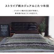 ジャガード織の凹凸感が特徴的な素材感があるこたつ布団です。お部屋の雰囲気気を崩さない淡い色目とカジュアルでお部屋に合いやすいストライプ柄にしました。薄手なので折りたたんでもかさばらず、コンパクトに収納できます。部分暖房のコタツは電気代もおトクです。