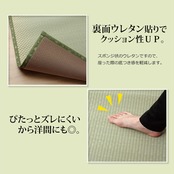 上敷きを敷くだけで畳のお部屋をリフレッシュ出来ます。日焼けしてしまった畳のリフレッシュに、新品の畳を汚さないためのカバーにご使用下さい。お部屋の形に合わせて簡単にカットできる、フリーカットタイプです。裏にはウレタンを貼っていますので適度なクッション性があります。長さ110〜115cmの国産(九州産)い草を使用しています。そのうち約95cmを使用しています。ヘリ際はある程度白みを帯びます。(白い部分は日焼けではありません、い草の根元と先端部分の色です。)い草は長いものほど高級になります。い草は先端部分が赤茶色く、根元が白く真中が青(緑)色です。真中の良質な青の部分を多く使用するほど、丈夫で綺麗な仕上がりとなります。またイ草は使用するうちに日焼けをしますが、真中の青の部分を多く使用したものほど、全体が綺麗にムラなく日焼けし、味が出ます。国産(九州産)のい草を使用しています。国産い草は一本一本が太く、表皮が厚く繊維がキメ細かいので弾力性があり、耐久性に優れています。い草には空気の清浄化作用、湿度の調節作用があり、汚れにくいといった特徴があります。い草に青森ヒバ加工を施しています。(抗菌、防臭効果)