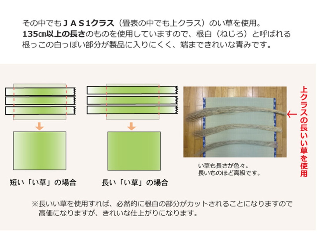 見た目の美しさと耐久性にこだわり抜いた上敷きです。経糸に麻糸と綿糸を使用し、通常の糸引織の2倍の糸量を使用しています。麻糸と綿糸を合わせることで糸自体が非常に丈夫になります。また一本一本が太くなるため、織り上げた際にはっきりと織りの凹凸が出て非常に綺麗です。上敷きを敷くだけで畳のお部屋をリフレッシュ出来ます。日焼けしてしまった畳のリフレッシュに、新品の畳を汚さないためのカバーにご使用下さい。通常畳表に使用される長さ135cm以上【JAS1クラス(畳表の中でも上クラス)】の国産(イ草の産地熊本県八代産)い草を使用しています。厳選された良質の太く長いイ草を高密度に織り込んでおりますので、丈夫で耐久性があり、素肌に心地よいボリューム感があります。長さ130cmのうち約88cmを使用しています。ヘリ際の白い部分が少ない、長いイ草を使用した高級な商品です。(白い部分は日焼けではありません、い草の根元と先端部分の色です。)い草は長いものほど高級になります。い草は先端部分が赤茶色く、根元が白く真中が青(緑)色です。真中の良質な青の部分を多く使用するほど、丈夫で綺麗な仕上がりとなります。またイ草は使用するうちに日焼けをしますが、真中の青の部分を多く使用したものほど、全体が綺麗にムラなく日焼けし、味が出ます。こちらの商品は畳表と同じ織り方の糸引織で仕上げました。双目織りと比べて、い草の打ち込み本数が多いため丈夫です。表面が滑らかなので、ホコリなどがたまりにくいのが特徴です。長くご使用されたい方や、耐久性をお求めの方には糸引織をおすすめします。国産(熊本県八代産)のい草を使用しています。国産い草は一本一本が太く、表皮が厚く繊維がキメ細かいので弾力性があり、耐久性に優れています。い草には空気の清浄化作用、湿度の調節作用があり、汚れにくいといった特徴があります。青森県のヒバの木から抽出した「ヒバエッセンス」をメーカー独自の技術で生地表面に加工しました。ヒバエッセンスにはヒノキチオールという、天然物質としては極めて抗菌性の高い成分が含まれています。(無加工品に比べ抗菌、防臭効果があります。)表裏の両面が使えて経済的です。※自然素材であること、また職人が一つ一つ手作業にて加工を行うため、形状のバラツキや表示サイズと多少異なることがあります。ご了承下さい。