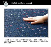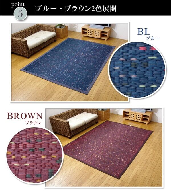 『柳川段通』シリーズのイ草カーペットです。柳川段通の特長として①厳選したイ草を通常の商品よりも約1.4倍(メーカー比)使用しています。②ヘリ生地は久留米織りの生地を使用しています。久留米織りとは福岡県久留米地方の伝統的な織りもので、着物や洋服によく使われている貴重な織りものです。③本商品の織り職人はこの道一筋20年〜40年の熟練の匠です。国産(九州産)のい草を使用しています。一本一本が太く、表皮が厚く繊維がキメ細かいので弾力性があり、耐久性に優れています。い草には空気の自然浄化作用、湿度の調節作用などがあります。また汚れにくく、使用するうちに黄金色に変化し味が出ます。い草に青森ヒバ加工を施しています。(抗菌、防臭効果)