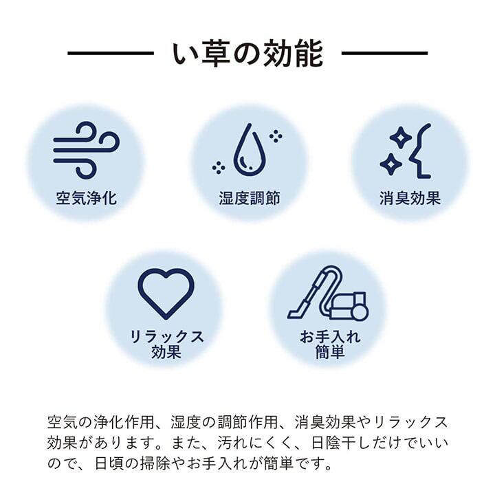 い草には空気の清浄作用、湿度の調整作用があります。また汚れにくく、使用するうちに黄金色に変化し味が出るため長くお楽しみいただけます。