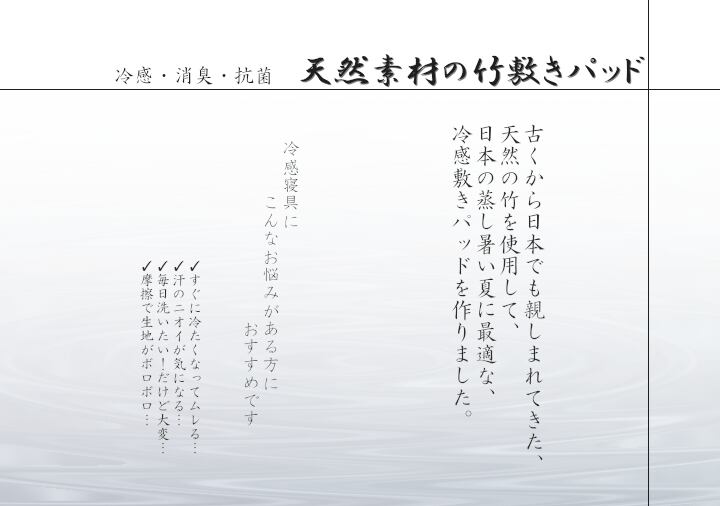 髪の毛や体毛がひっかかりにくいよう、フレームに柔らかいPPを使用した竹のシーツです。フレームが柔らかいので、どこからでも折りたたむことができ、コンパクトに収納できます。また竹駒のサイズは28mm×15mmと一般的なものよりひとまわり小さくしていますので、より体にフィットします。素材は麻雀竹の産地である福建省で育った天然の竹を使用しています。猛宗竹のひんやり感のある表面部分を使用しています。竹の表皮は、熱を吸収する機能に優れています。竹の持つこの特長が、ひんやりとした肌さわりをもたらします。綿素材と比較して体感温度が下がり、寝苦しい夜を快適にサポートしてくれます。マットレスなどの上に敷いてもぴったりとフィットして竹の硬さを感じません。