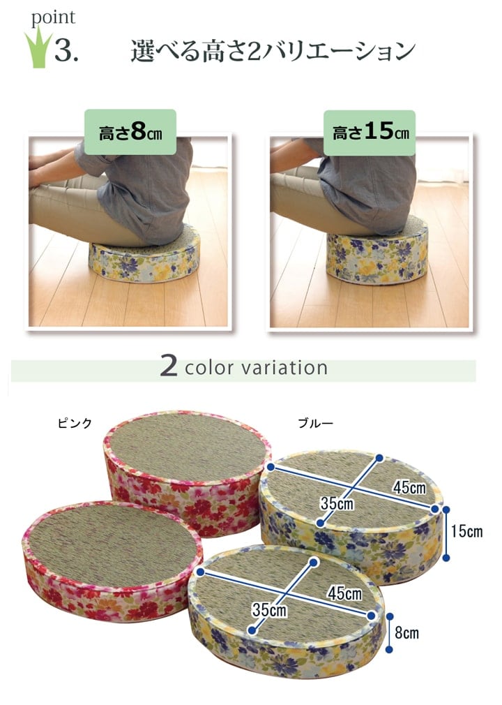 水彩タッチの花柄が特徴のい草クッションです。い草の効能として1.綿の約3倍の吸湿力 2.蒸れにくい。汗による湿気を吸うことにより温度を下げ快適な就寝を促します。 3.汗のにおいを軽減。汗のにおいの元となる化学物質を90%以上抑えます。腰掛やソファーの足掛けにも使えます。