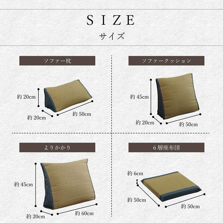 さまざまな姿勢に適した形のバリエーションがあります。おうちでゆっくりくつろぐ際に活躍してくれます。い草には、空気をきれいにする、湿度を整える、高い吸湿性、消臭、汚れにくい、燃えにくい、森林浴効果などの効果があります。