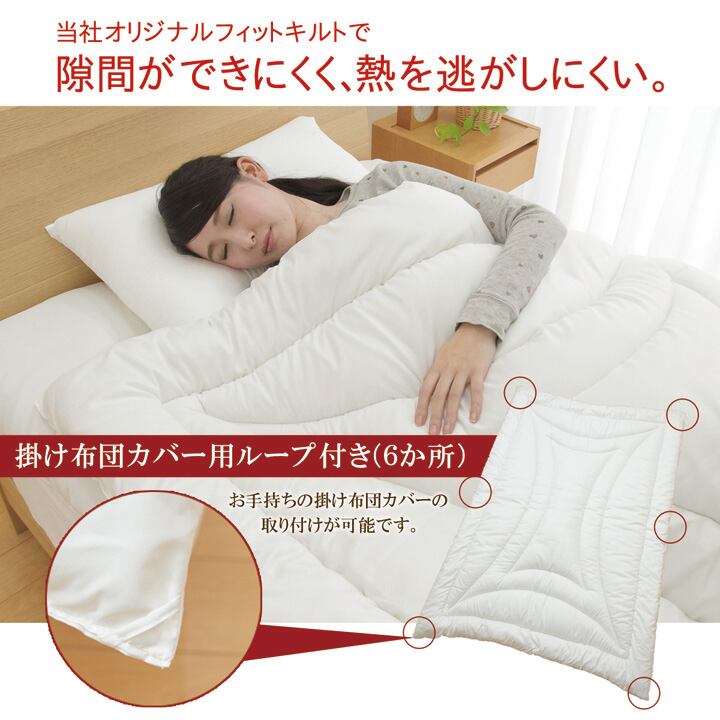 体にフィットしやすいこだわりの「フィットキルト加工」で、隙間ができにくく、熱を逃がしにくい掛け布団です。また、中材に使用しています「フィルハーモニー」は、①抗菌防臭性②防ダニ性の2点に優れており、清潔で快適な睡眠ができます。