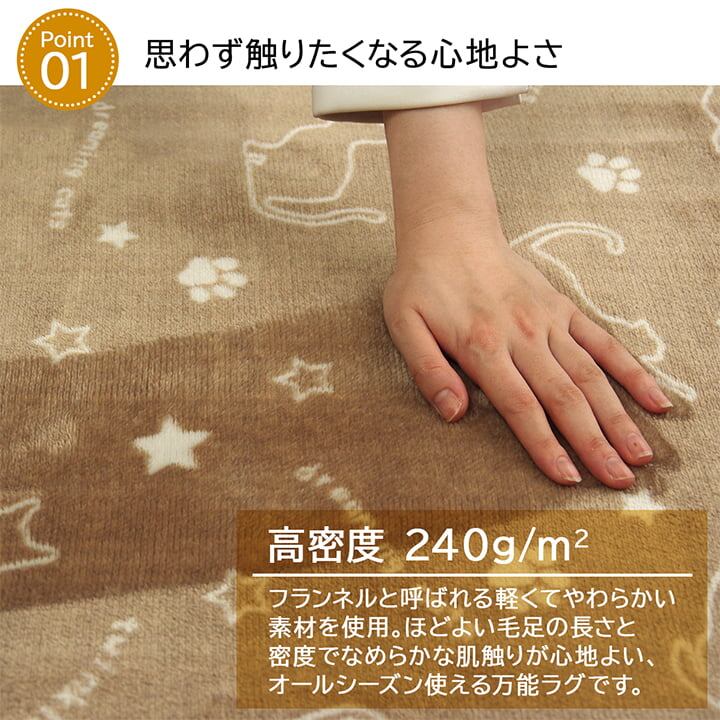 生地に抗菌・防臭加工を施した,ラグカーペットです。表地にはフランネルと呼ばれる,しっとりとして非常に柔らかい生地を使用しています。軽量で持ち運びが楽々です。薄手で小さく折りたたむことができますので,収納時にも場所を取りません。フローリングを傷つけにくいよう,裏には不織布を貼っています。ご家庭の洗濯機で洗えるウォッシャブル仕様ですので,清潔にご使用頂けます。電気カーペットカバーとしてもご使用頂けます。季節を選ばすオールシーズンご使用頂けます。多サイズ展開で,ワンルームから子ども部屋,リビング・ダイニング,ベッドサイド,ソファ前にも。いろいろなシーンに合わせてお選び下さい。※ 掲載写真は表記サイズと異なる場合がございます。※ 画面上のカラーはご使用ブラウザやモニターの設定により,実物とは若干異なる場合がございます。あらかじめご了承の上,ご注文をお願いいたします。