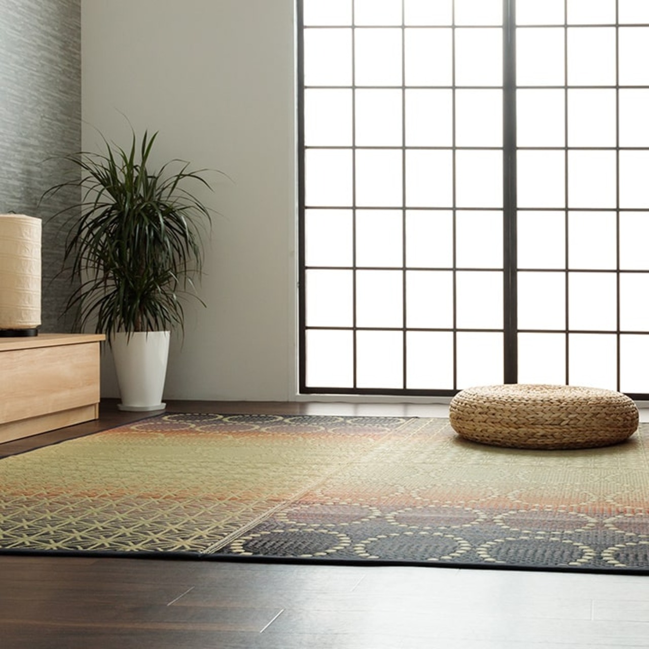 和モダンなデザインがどんなお部屋にも合わせやすいい草ラグです。