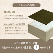 組み立て式のダンボール製小上がりと置き畳のセット商品で簡単にお部屋に小上がり和室がつくれます。小上がりは軽量な段ボール製です(小上がりだけで1個、約4.3Kg)。段ボール製で軽いので楽に移動ができ、簡単に模様替えができます。組み立て式なので使わなくなったり引っ越しする際も容易に解体できてコンパクトに収納したり持ち運べて便利です。段ボール製で廃棄も簡単です。再利用が可能なのでとてもエコな商品です。なつかしい畳の香りと肌ざわりを手軽に楽しめます。い草には空気の自然浄化作用、湿度の調節作用などがあります。置き畳の中材は木製ボードタイプ+ポリエチレンで程よいクッション性と重量感があります。