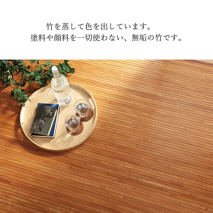 孟宗竹の表面付近の目がぎっしり詰まった部分のみを使用した竹ラグです。表面部分は特に汚れにくく耐久性に優れ、熱伝導率が高いため、ひんやり感も抜群です。表面の肌触りを滑らかにするため、また竹の色を揃えるためにUV塗装を施しています。また無垢材を使用し、あたたかみのある質感に仕上げました。スモークすることで色を出しています。染料、顔料は使用していません。シンプルな糸無しの張り付けタイプです。素材は皮下17mm幅の竹ヒゴを使用しています。17mmの竹ヒゴは大きく育った竹からしか取れない素材です。竹は他の木材と比べると格段に成長が早く(3〜5年で成竹)、持続的生産が可能な環境に優しいサスティナブルな素材です。