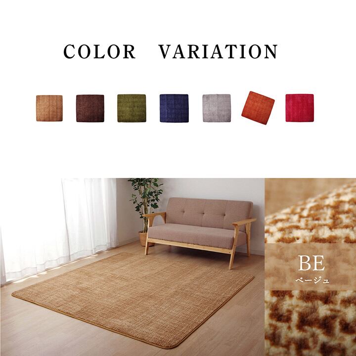 無地系のシンプルデザインです。表地は針抜きでポコポコとした凹凸を出し、なめらかな肌触りの珊瑚マイヤーを使用しています。裏面には滑りにくい加工を施しています。毛足が短いため、お掃除が簡単です。床暖房・ホットカーペット対応です。オールシーズンお使いいただけます。