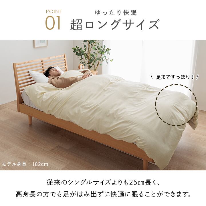 従来のシングルサイズよりも35㎝の長く、高身長の方でも足がはみ出ずに快適に眠ることができます。