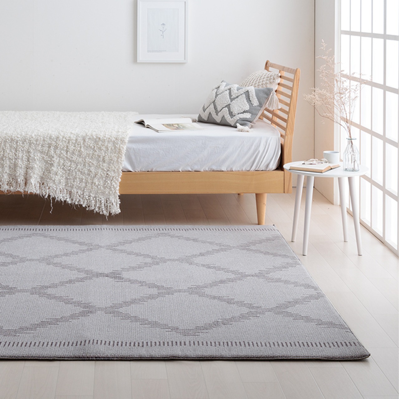格子柄のベニワレン風ラグでおしゃれなモロッカンテイストに。シンプルなお部屋や北欧スタイルなど、幅広いインテリアにマッチします。