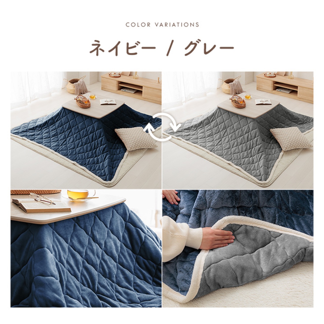用途はこたつ上掛けカバーだけでなく、こたつ掛け布団・中掛け布団・ブランケットとしてなど使い方は様々です。