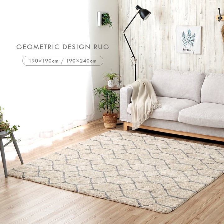 触れるとふわっとやわらかく心地よいラグ。モダンな幾何学デザインがお部屋の上品なアクセントに。