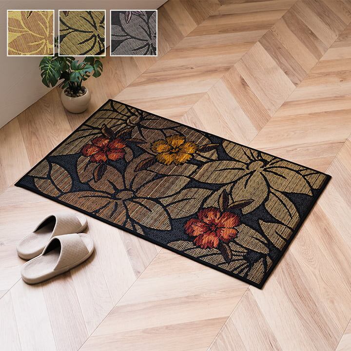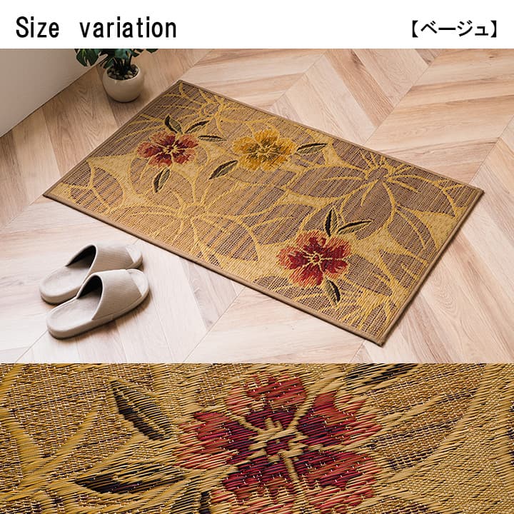 縦糸の本数が多い袋織りという技法で繊細な柄を出しています。折れ曲がりが複雑なので長いイ草を使用しないと切れてしまいます。縦糸が密なので、しっかりとして破れにくいのが特徴です。九州産のい草を使用しています。一本一本が太く、表皮が厚く繊維がキメ細かいので弾力性があり、耐久性に優れています。い草には空気の自然浄化作用、湿度の調節作用などがあります。また汚れにくく、使用するうちに黄金色に変化し味が出ます。青森ヒバ加工を施しています。(抗菌、防臭効果)裏には適度なクッション性があり、滑りにくい国産のウレタンを貼っています。