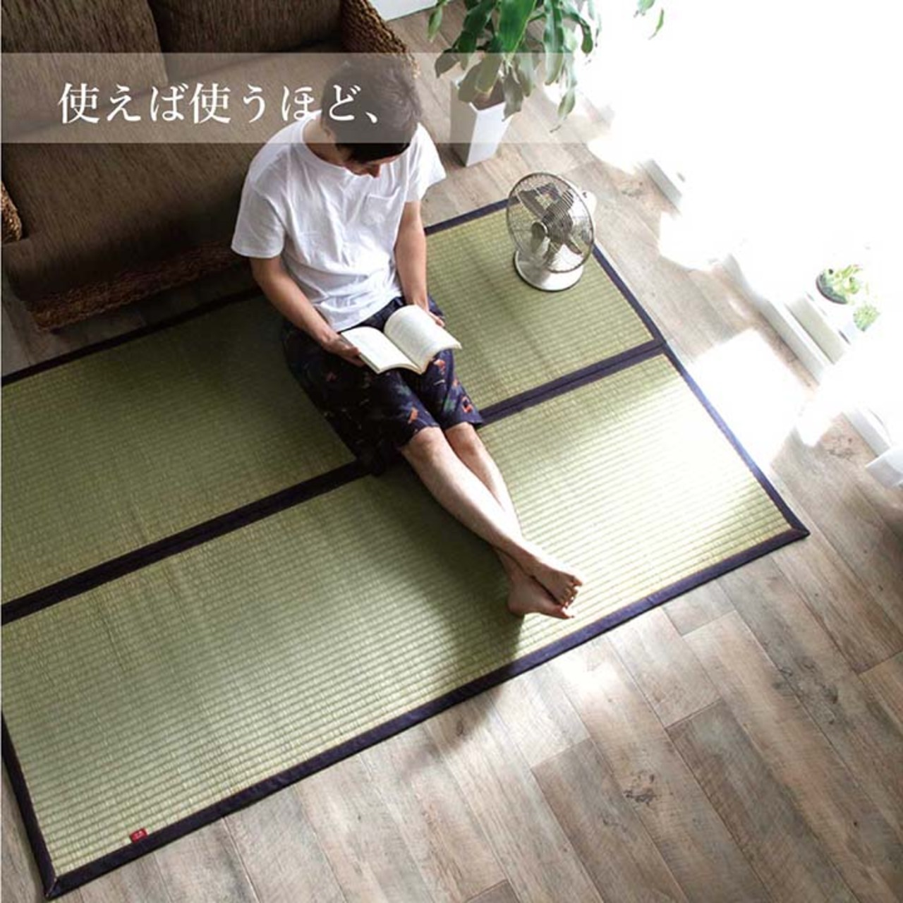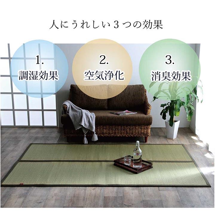 その為い草特有の機能である湿気の吸放出効果も約2倍程となり、夏場のムシムシとした湿り気を吸収してくれる他、寝転がった時の汗のべとつき感も無く、さらっとしたタッチ感とざっくりとした踏み心地がくせになる商品です。