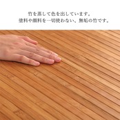 孟宗竹の表面付近の目がぎっしり詰まった部分のみを使用した竹ラグです。表面部分は特に汚れにくく耐久性に優れ、熱伝導率が高いため、ひんやり感も抜群です。表面の肌触りを滑らかにするため、また竹の色を揃えるためにUV塗装を施しています。また無垢材を使用し、あたたかみのある質感に仕上げました。スモークすることで色を出しています。染料、顔料は使用していません。シンプルな糸無しの張り付けタイプです。素材は皮下17mm幅の竹ヒゴを使用しています。17mmの竹ヒゴは大きく育った竹からしか取れない素材です。竹は他の木材と比べると格段に成長が早く(3〜5年で成竹)、持続的生産が可能な環境に優しいサスティナブルな素材です。