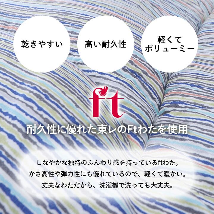耐久性に優れた東レのFt綿を使用しています。乾きやすく、軽量ですがボリューミーなのも特徴です。