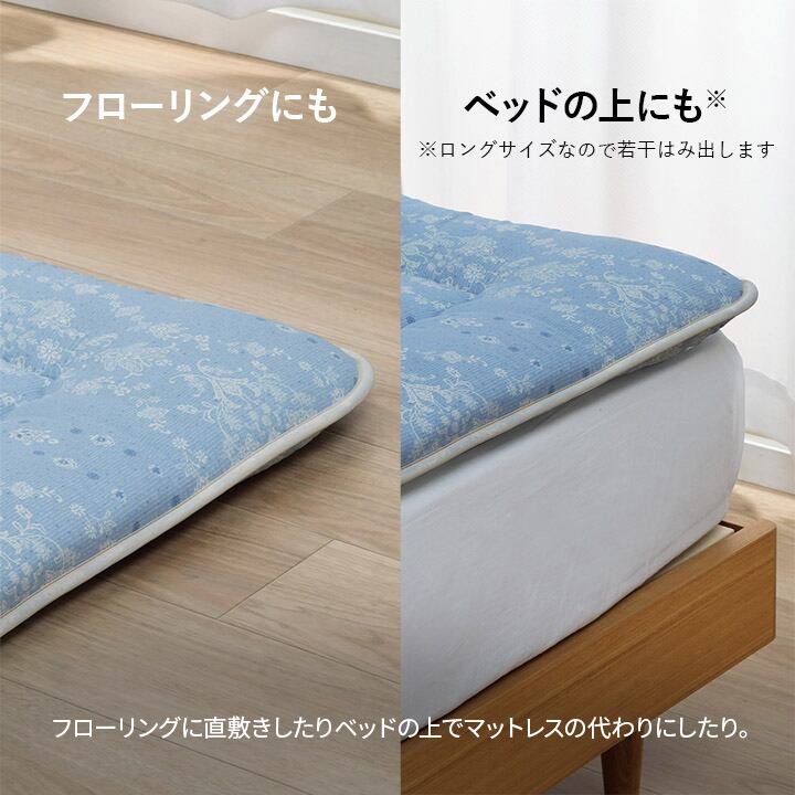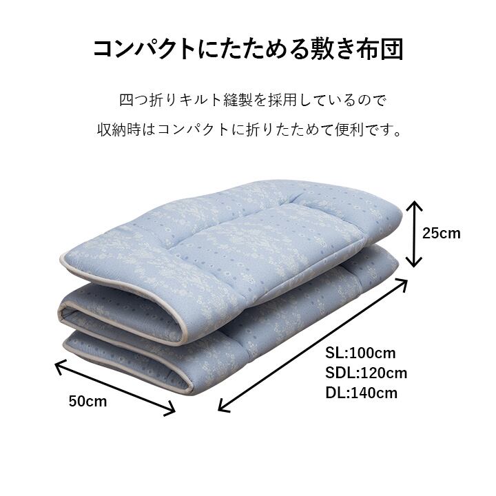 敷布団は、四つ折りキルト縫製を採用しているので、収納時はコンパクトに折りたためて便利です。