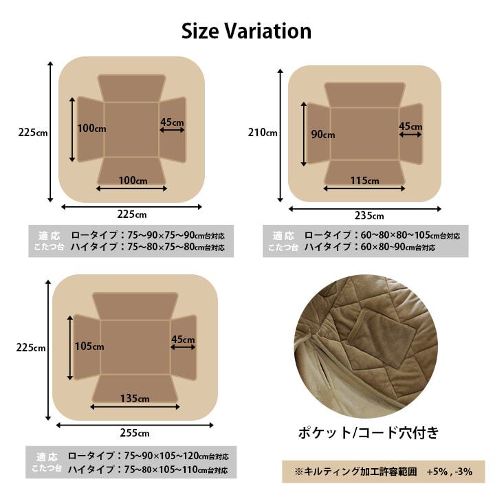 ハイタイプ・ロータイプどちらのこたつ台にも使えるこたつ布団です。