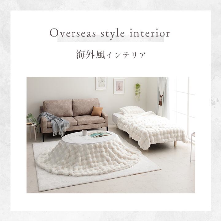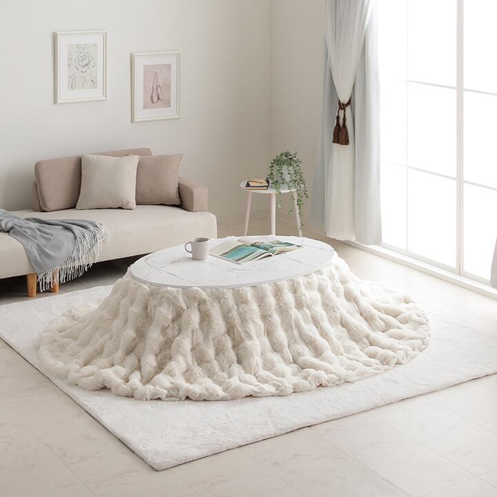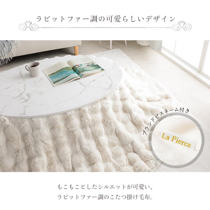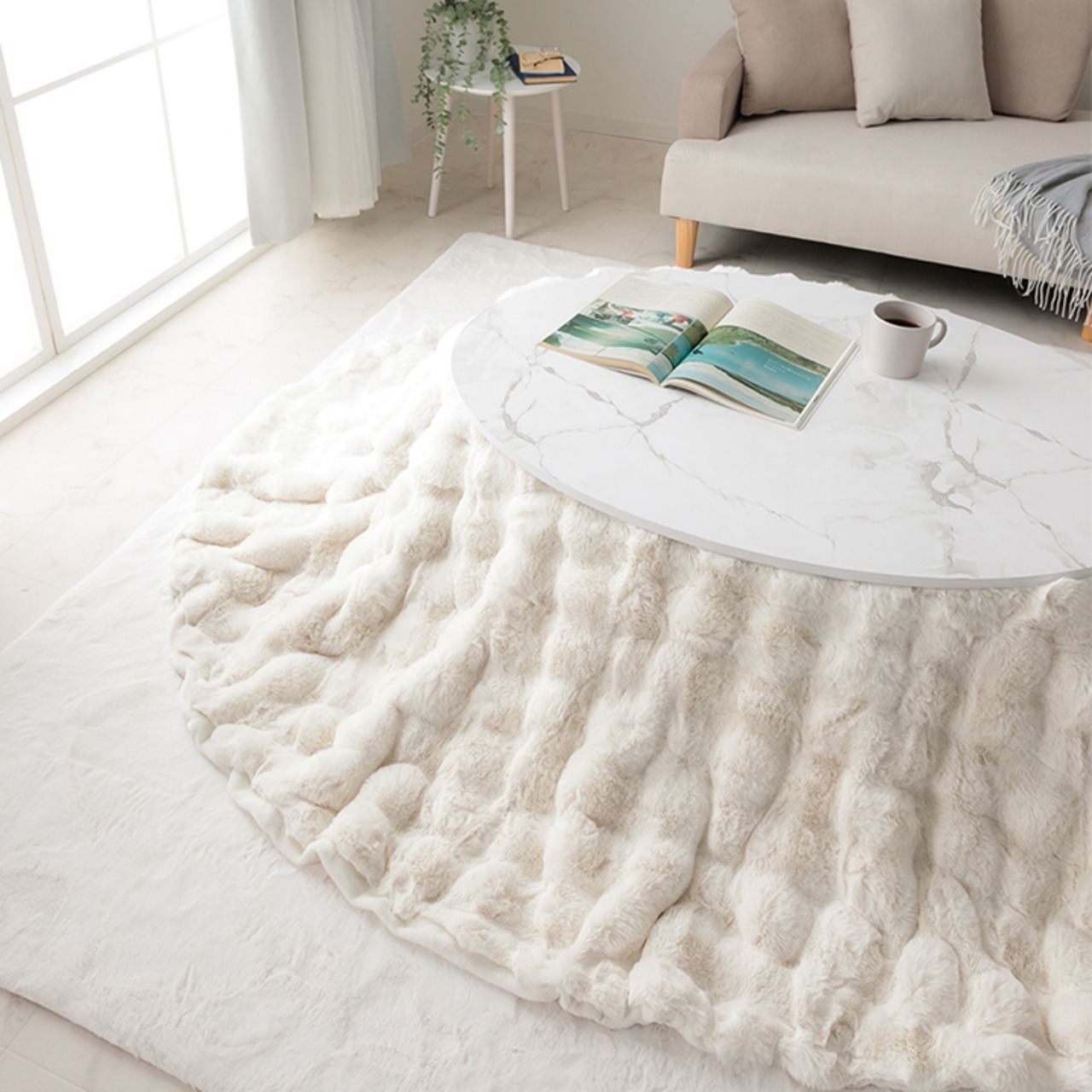 もこもことしたシルエットが可愛い、ラビットファー調のこたつ掛け毛布です。
