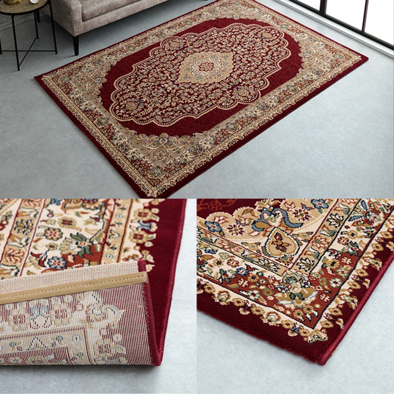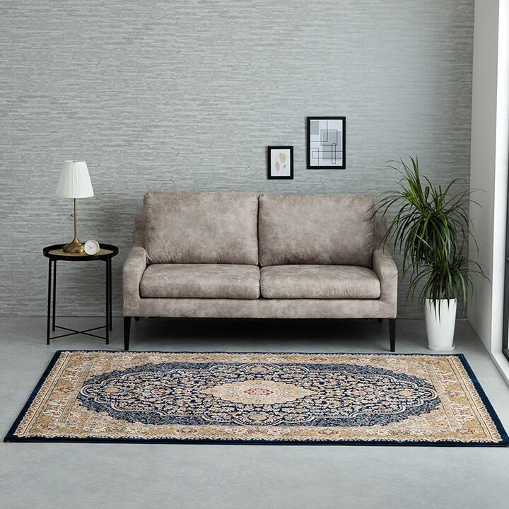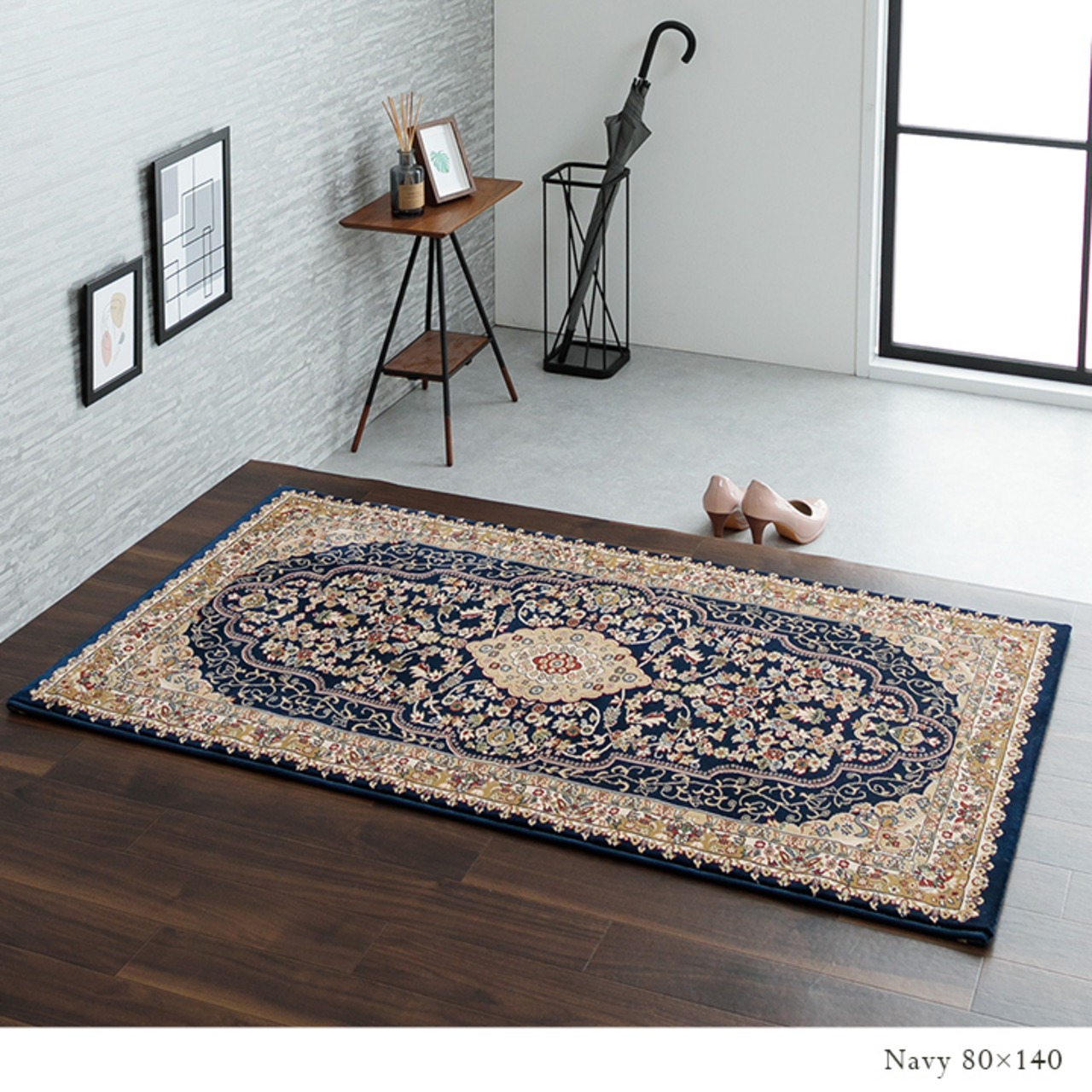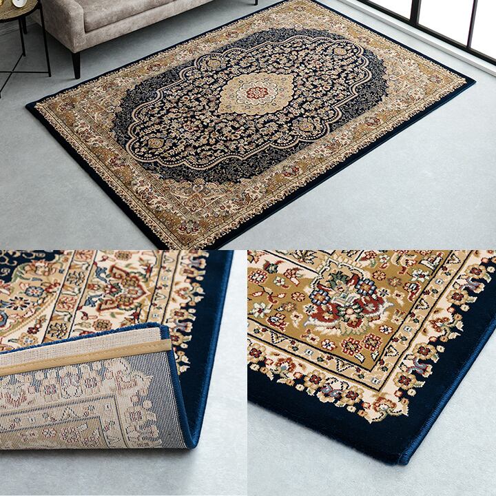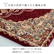 トルコ製の最高級ウィルトン織りカーペットです。ウィルトン織りは、非常に耐久性の高いカーペットです。家の中でも靴を履いて生活するヨーロッパで、土足で扱うことを前提として作られておりますので、長時間踏みつけてもヘタリにくく、弾力性もあり長くご使用頂けます。また、高密度にパイルを織り上げることで、耐久性プラス繊細な柄を表現できるのも特徴です。本商品の『繊維の密度を表すノット数』は75万ノットの最高級クラスです。ぎっしりとパイルが詰まっていますので弾力性に富み踏み心地もしっかりとしています。また、パイル数を多くすることにより、より繊細でより色鮮やかなメダリオン柄を表現しました。プリントものには出せない高級感・重厚感のある繊細な柄をお楽しみ下さい。本商品のパイル部分にはポリプロピレン素材を使用しております。ポリプロピレンはヘタリにくく、耐久性に優れ、繊維の中でも軽い素材です。また、汚れが付着しにくく、遊び毛や毛玉が非常に出にくいという特徴もあります。本商品にはヒートセット加工を施しております。ヒートセット加工をすることで、柔らかく、なめらかなタッチ感に仕上げました。ホットカーペットカバーや床暖房にも対応しております。安心して年間お使い頂けるカーペットです。