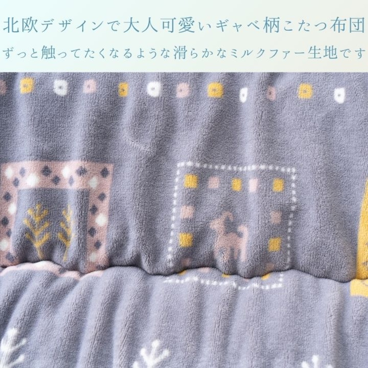 北欧デザインで大人可愛いギャベ柄こたつ布団。ずっと触ってたくなるような滑らかなミルクファー生地です。日本製ボリュームこたつ布団(東レ・マッシュロン綿)仕様カバーのずれ防止のループ付きです。