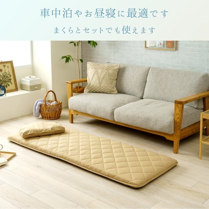 車中泊やお昼寝に使うことができる3層構造のマットレスです。ゴムバンドがついているため、楽に持ち運びや収納ができる商品となっています。