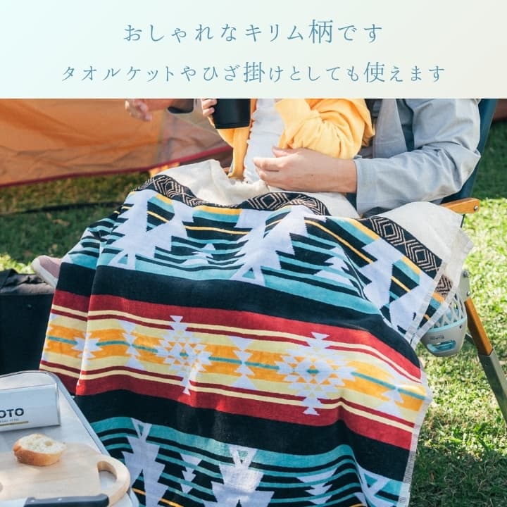 おしゃれなキリム柄で、ブランケットやタオルケット、敷カバーとしても使うことができます。