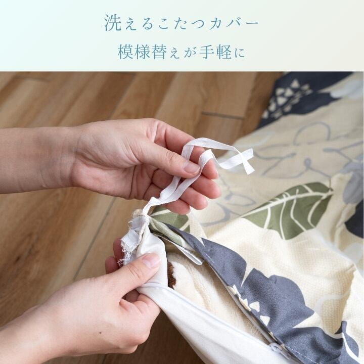花柄デザインの表地・裏地にピーチスキン素材を使用し、柔らかな肌触りのこたつカバー。洗えるのでお手入れも簡単