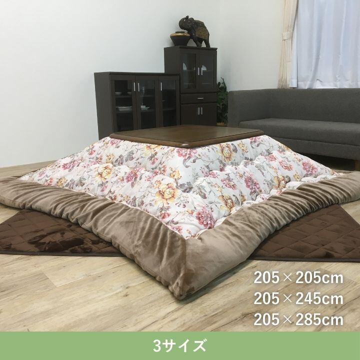 上品で華やかなデザインのこたつ布団。裏地は滑らかで肌触りの良いフランネル素材を使用しています。日本製こたつ布団でボリュームがあり、保温性がある中綿を使用しています。
