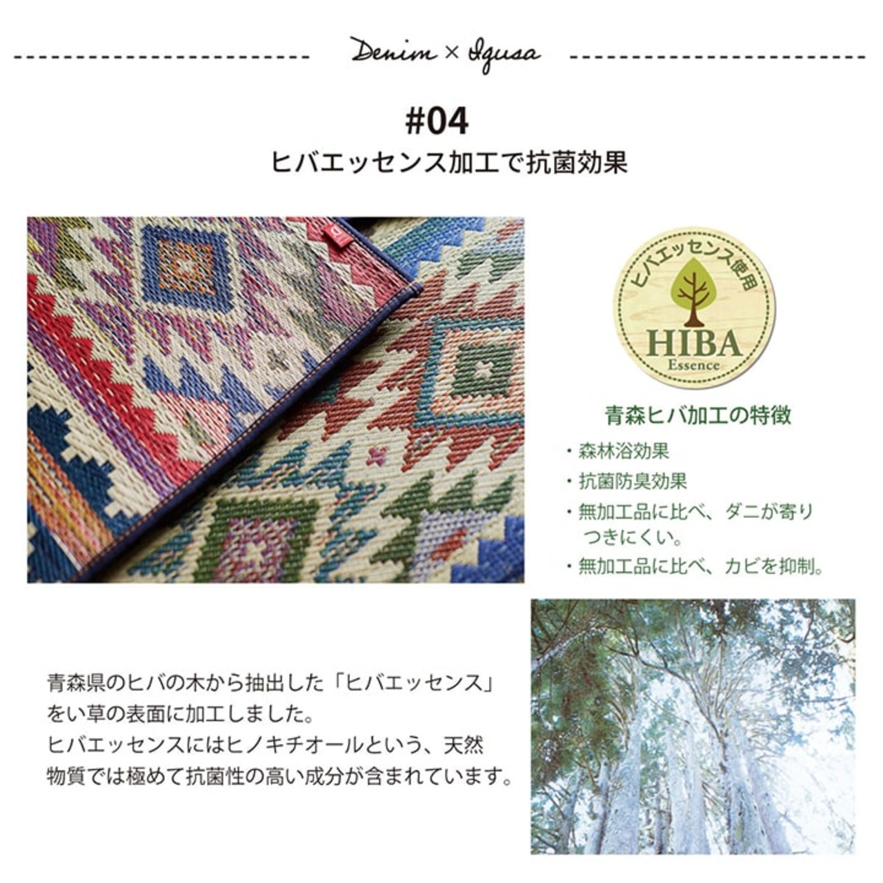 個性的なネイティブ柄で、お部屋の雰囲気をがらりと変えてくれる商品です。裏はウレタンフォーム12mmとクッション性が高く、床を傷つけにくいです。また滑りにくいのでフローリングに最適です。国産(九州産)のい草を使用しています。一本一本が太く、表皮が厚く繊維がキメ細かいので弾力性があり、耐久性に優れています。い草には空気の自然浄化作用、湿度の調節作用などがあります。い草に青森産天然ヒバから抽出した植物由来成分で【抗菌防臭加工】をほどこしています。