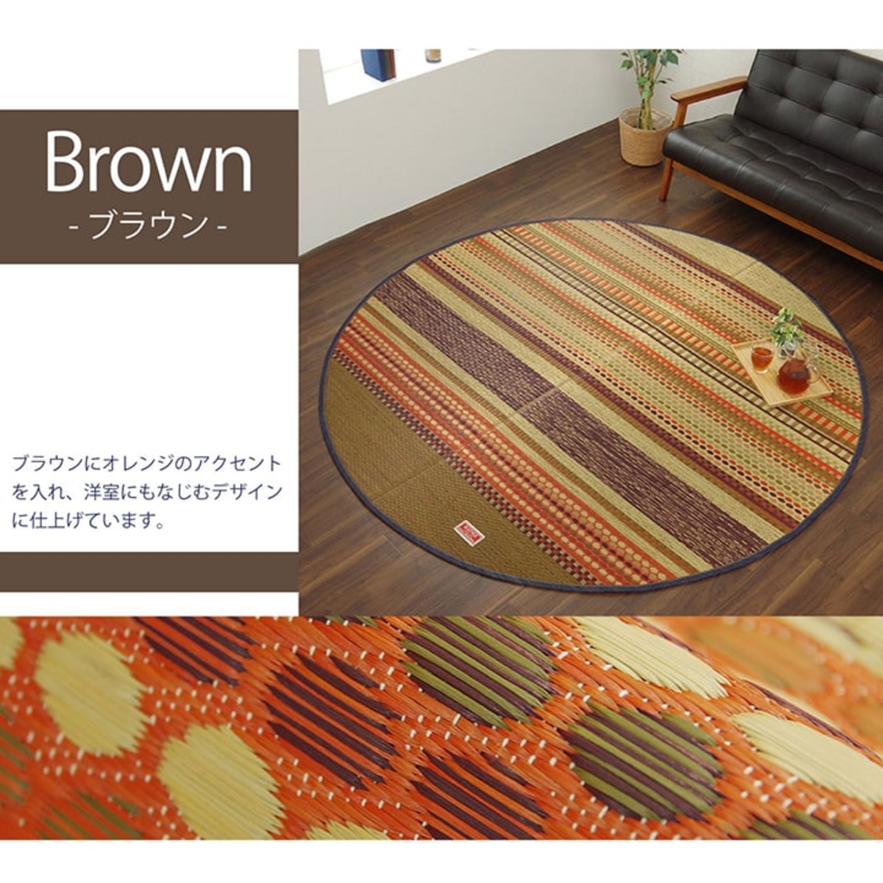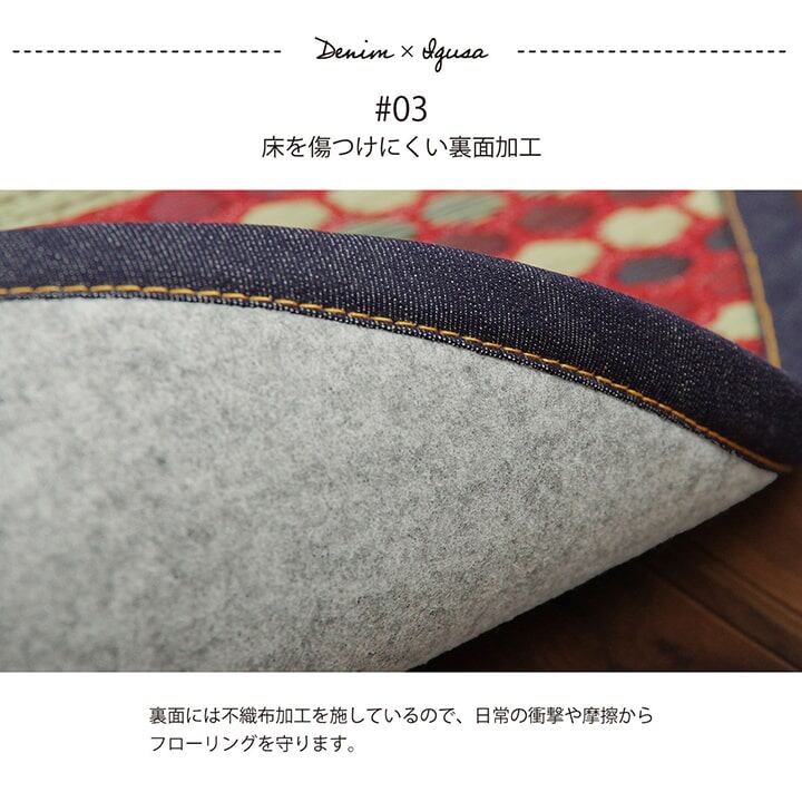 広島県福山市のデニム生地メーカー、カイハラ株式会社の生地をヘリで使いました。イ草生地は袋織りという技法で繊細な柄を出しています。折れ曲がりが複雑なので長いイ草を使用しないと切れてしまいます。縦糸が密なので、しっかりとして破れにくいのが特徴です。国産(九州産)のい草を使用しています。一本一本が太く、表皮が厚く繊維がキメ細かいので弾力性があり、耐久性に優れています。い草には空気の自然浄化作用、湿度の調節作用などがあります。裏にはフローリングを傷つけにくいよう、不織布を貼っています。い草に青森ヒバ加工を施しています。(抗菌、防臭効果)