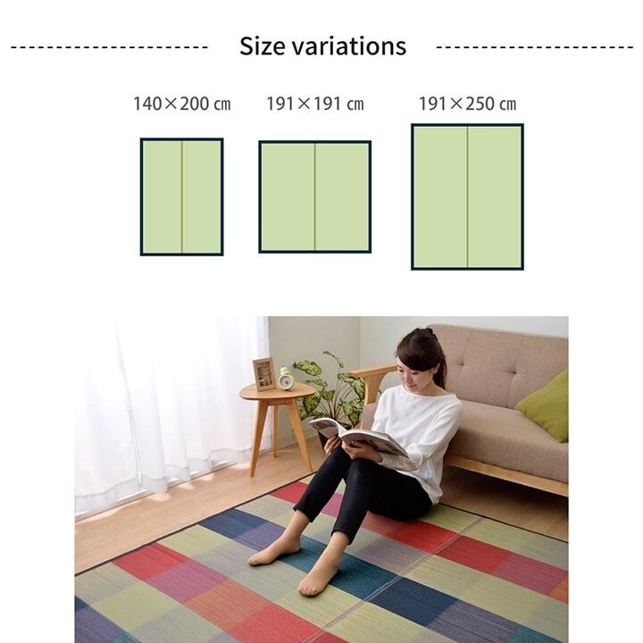広島県のデニム生地メーカーとコラボした商品です。デニムの生地をヘリに使用しました。カラフルない草とデニムは相性ばっちりです。お部屋の雰囲気をがらりと変えてくれる商品です。国産(九州産)のい草を使用しています。一本一本が太く、表皮が厚く繊維がキメ細かいので弾力性があり、耐久性に優れています。い草には空気の自然浄化作用、湿度の調節作用などがあります。裏には国産のウレタンを使用しほどよいクッション性を持たせました。い草に青森ヒバ加工を施しています。(抗菌、防臭効果)