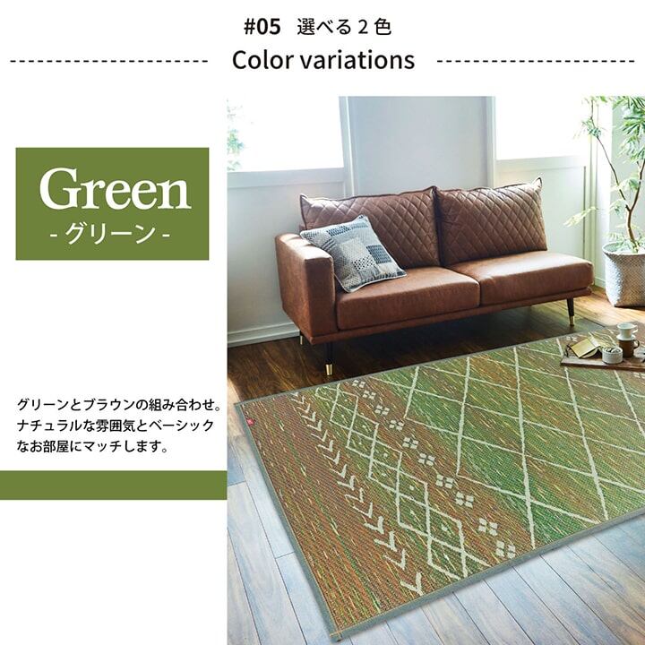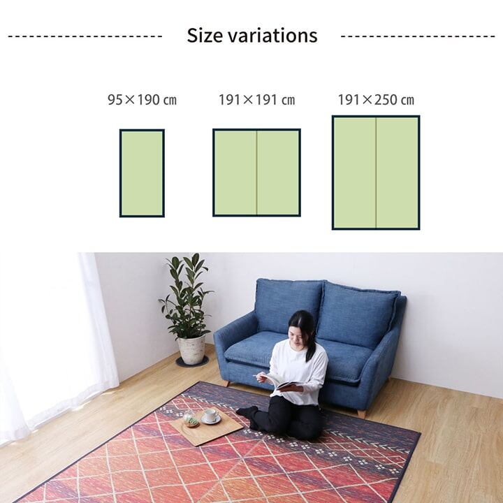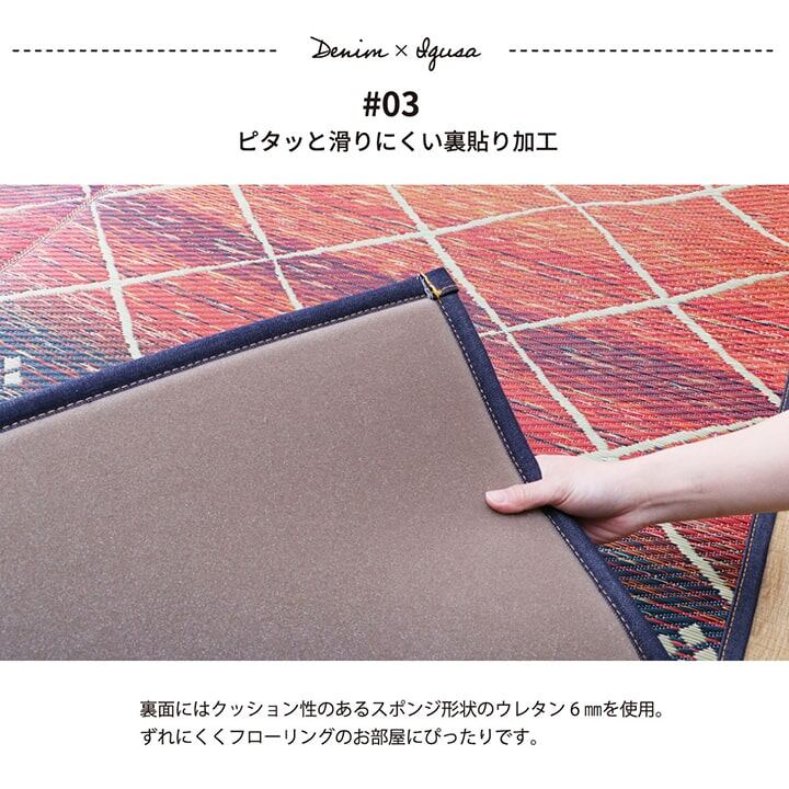 裏にはウレタンフォームでほどよいクッション性を持たせているので床を傷つけにくく滑りにくいです。国産(九州産)のい草を使用しています。一本一本が太く、表皮が厚く繊維がキメ細かいので弾力性があり、耐久性に優れています。い草には空気の自然浄化作用、湿度の調節作用などがあります。
