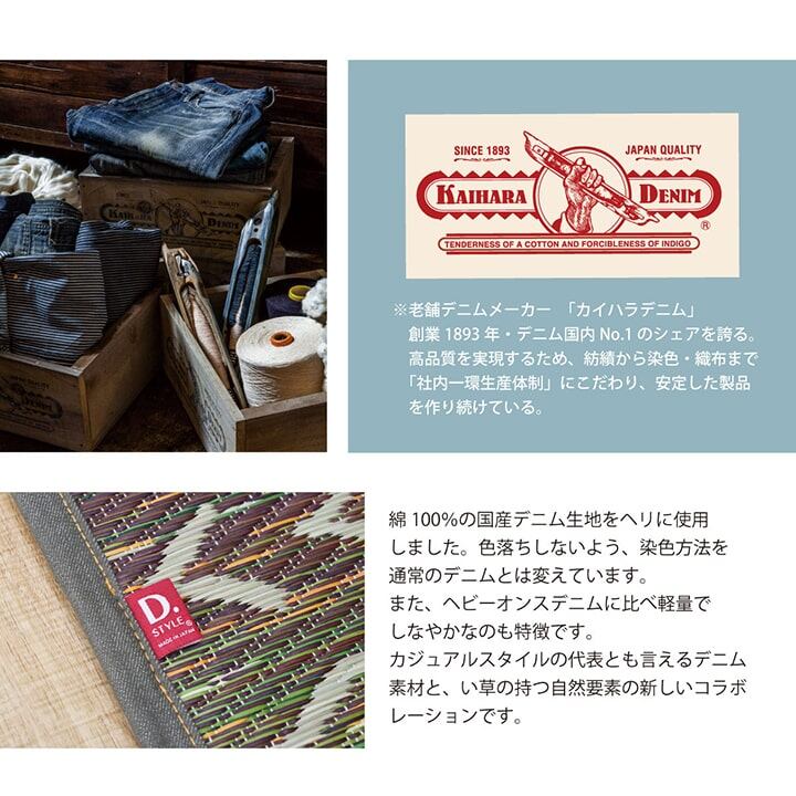 広島県のデニム生地メーカーとコラボしたい草ラグです。デニムの生地をヘリに使用しました。カラフルない草とデニムは相性ばっちりです。