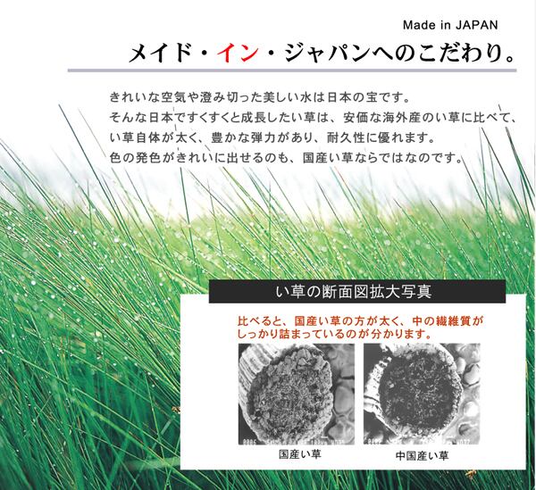 広島県福山市のデニム生地メーカー、カイハラ株式会社の生地をヘリで使いました。イ草生地は袋織りという技法で繊細な柄を出しています。折れ曲がりが複雑なので長いイ草を使用しないと切れてしまいます。縦糸が密なので、しっかりとして破れにくいのが特徴です。国産(九州産)のい草を使用しています。一本一本が太く、表皮が厚く繊維がキメ細かいので弾力性があり、耐久性に優れています。い草には空気の自然浄化作用、湿度の調節作用などがあります。裏にはウレタンを貼っていますので、適度なクッション性があります。い草に青森ヒバ加工を施しています。(抗菌、防臭効果)